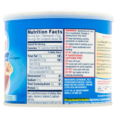 Crisco shortening ingredients label. Crisco All-Vegetable Shortening Allergy and Ingredient Information Crisco® all-vegetable shortening. Great for cooking & baking. Use instead of butter or margarine. 50% less saturated fat than butter. 0g trans fat per serving. See directions for use. 12g fat per serving. See nutrition information for fat and saturated fat content. INGREDIENTS and MAY CONTAIN STATEMENTS: Signup to Read the Label Crisco All-Vegetable Shortening, 6 lb - Walmart.com Do not put water on hot or flaming shortening. Ingredients Ingredients Soybean Oil, Fully Hydrogenated Palm Oil, Palm Oil, Mono and Diglycerides, TBHQ and Citric Acid (Antioxidants). Report incorrect product information 3/30/2022 Great for pie crusts This is excellent in my pie dough. All-Vegetable Shortening - Crisco 50% Less Saturated Fat than Butter*Crisco Shortening: 3.5g saturated fat per tablespoon. Butter: 7g saturated fat per tablespoon. Crisco Shortening contains 12g total fat per serving. Excellent source of ALA Omega-3 fatty acid*Contains 710mg of ALA per serving, which is 44% of the 1.6g Daily Value for ALA. *See Nutrition Information for Fat and ... Crisco Baking Sticks Butter Flavor All-Vegetable Shortening Use tray and lid in this package to store unused Crisco shortening sticks in your pantry. Best if used within 6 months of opening. Ingredients Soybean Oil, Fully Hydrogenated Palm Oil, Palm Oil, Mono and Diglycerides, TBHQ and Citric Acid (Antioxidants), Natural and Artificial Flavor, Beta-Carotene (Pro Vitamin a) Added for Color. Safety warning