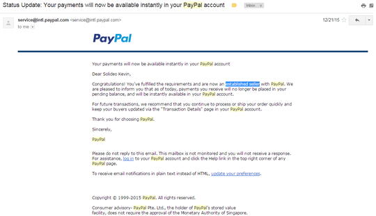 PayPal User Agreement - PayPal US Jul 28, 2022 · When you link PayPal Savings to your PayPal account, you authorize PayPal and Synchrony Bank to transfer funds between your eligible Balance Account and PayPal Savings in accordance with your instructions. ... If the payment is completed, PayPal will provide notice to you to ship the item. Otherwise, PayPal will cancel the payment and the funds ...