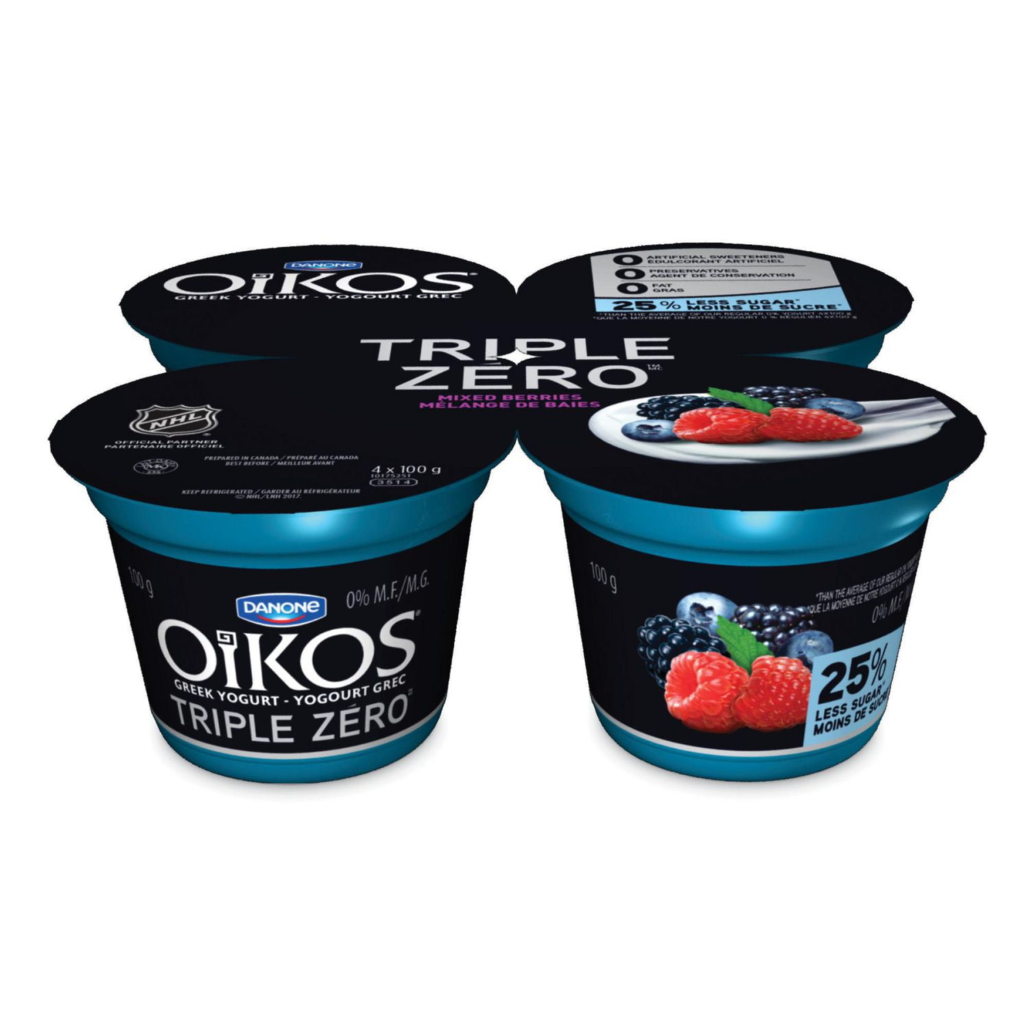 Oikos Triple Zero Mixed Berry Greek Yogurt, 5.3 Oz. Cups, 4 Count ... Oikos Triple Zero Greek Nonfat Yogurt gives you all the flavor you seek in a Greek yogurt--but with 0 added sugar*, 0 artificial sweeteners, and 0 fat, with 15 grams of protein per 5.3 oz cup. Full of delicious mixed berry flavor, this Greek nonfat yogurt makes a delicious snack any time of day.