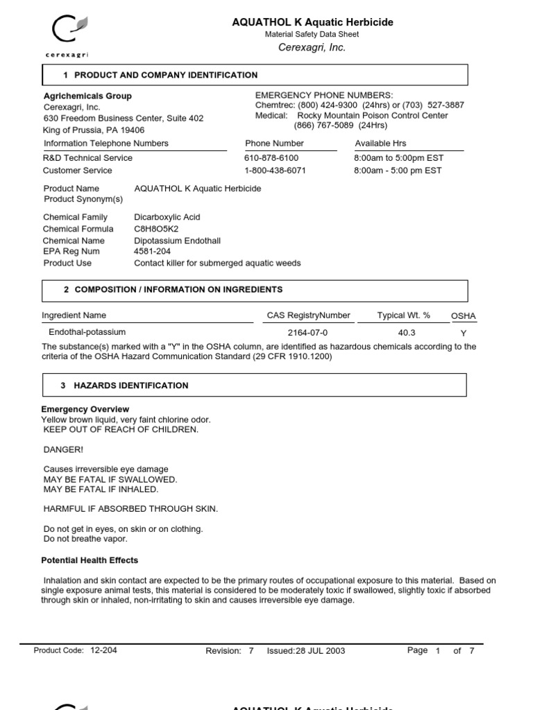 PDF Safety Data Sheet - Lake Pro, Inc Product Description: AQUATHOL® Super K Other means of identification Product code 12-388 UN/ID no. 2588 Registration number(s) 70506-191 Recommended use of the chemical and restrictions on use Recommended use Aquatic herbicide. Uses advised against Activities contrary to label recommendation Details of the Supplier of the Safety Data Sheet Aquathol K Aquatic Herbicide - Environmental Protection Agency x United Phosphorus, Inc. recommends not lowering reducing Aquathol K rates below those specified within this label, when using Aquathol K in a treatment combination, or as a tank mix, with product(s) containing ALS inhibitor active ingredients, unless specified otherwise on this label or a United Phosphorus, Inc. supplemental label. PDF US EPA, Pesticide Product Label, AQUATHOL SUPER K GRANULAR AQUATIC ... UPL NA Inc. recommends not reducing Aquathol Super K rates below those specified within this label, when using Aquathol Super K in a treatment combination with product(s) containing ALS inhibitor active ingredients, unless specified otherwise on this label or a UPL NA Inc. supplemental label. HOW TO APPLY: Aquathol Super K is a contact ... US EPA, Pesticide Product Label, AQUATHOL K AQUATIC ... Mar 12, 2019 ... Label Amendment - Update to Engineering Controls. Product Name; AQUATHOL K AQUATIC HERBICIDE. EPA Registration Number; 70506-176.